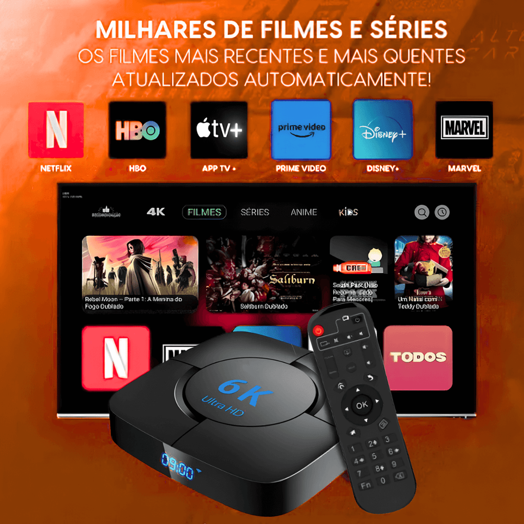 Cansado dos mesmos canais de sempre na sua TV?Transforme sua TV em um verdadeiro centro de entretenimento com aTV Box 6K Ultra HD— sem mensalidades e com acesso vitalício!